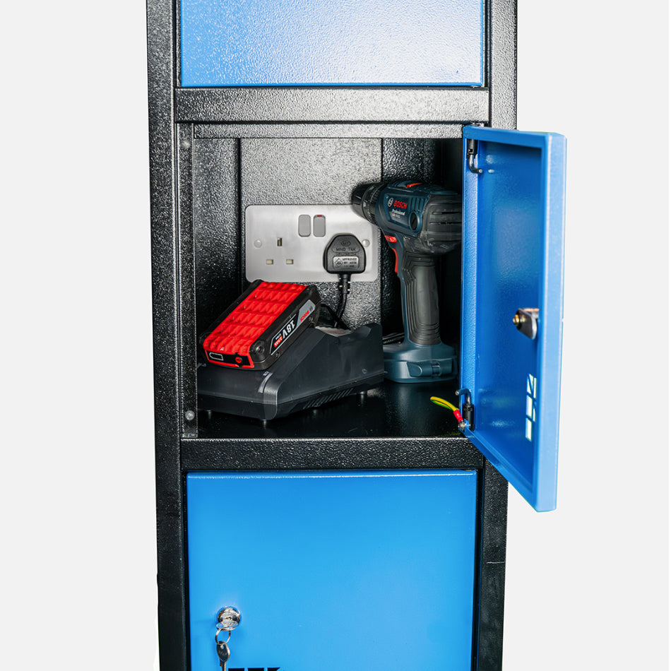 Each compartment comes with a double UK standard 3 pin 240V socket, allowing you to charge 2 tools per compartment, 12 altogether.