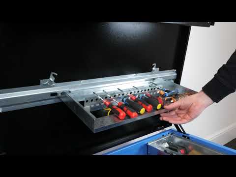 The tool holder sits on a steel bar that fits to the top of our Tuffboxes, with two simple hook hinges to open and shut when needed. The multi-tool holder can be shut flat into the lid when not in use, so it doesnβt get in the way of access to any of your power tools and equipment in the box below.